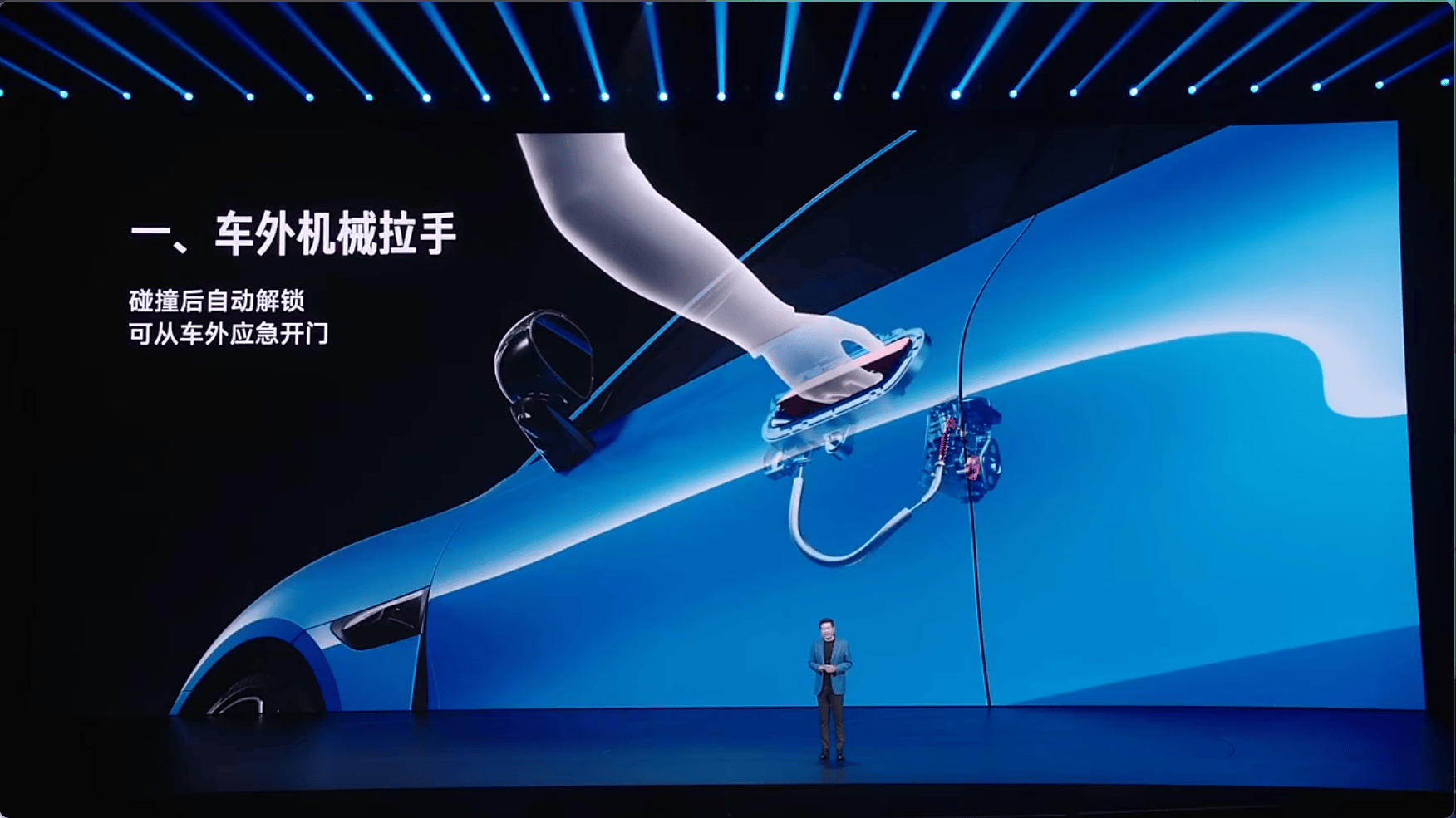 针对极端工况下的逃生设计,新一代SU7的门把手提前100%符合将于2027年实施的新国标。车辆不仅配备车外机械拉手和车内四门应急机械拉手,还搭载了具备三重冗余备份的三套电源系统 。在动力电池与小电池同时断电的极端工况下,冗余备用电源仍可保障车门紧急开启。