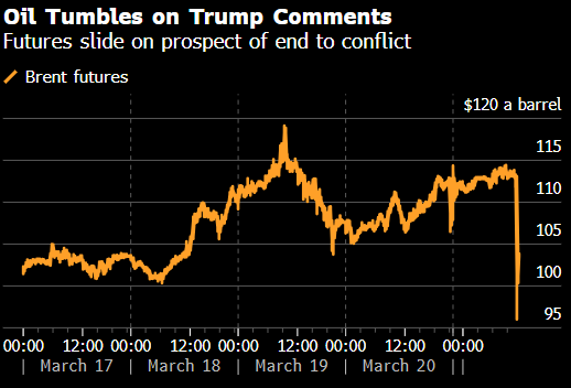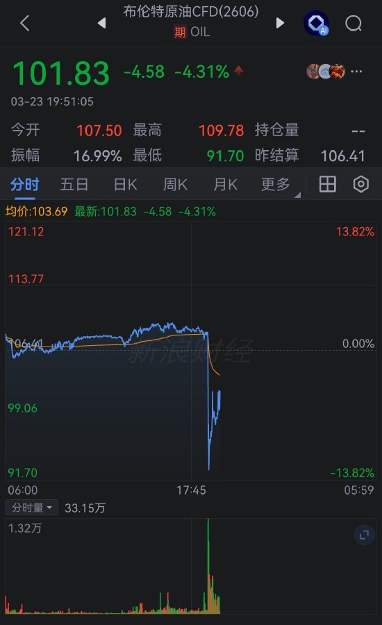 布伦特原油期货大幅下跌,此前美国总统特朗普表示,在围绕结束与伊朗的战争进行讨论后,他已指示美军将将针对伊朗发电厂和能源基础设施的任何及所有军事打击暂缓五天。