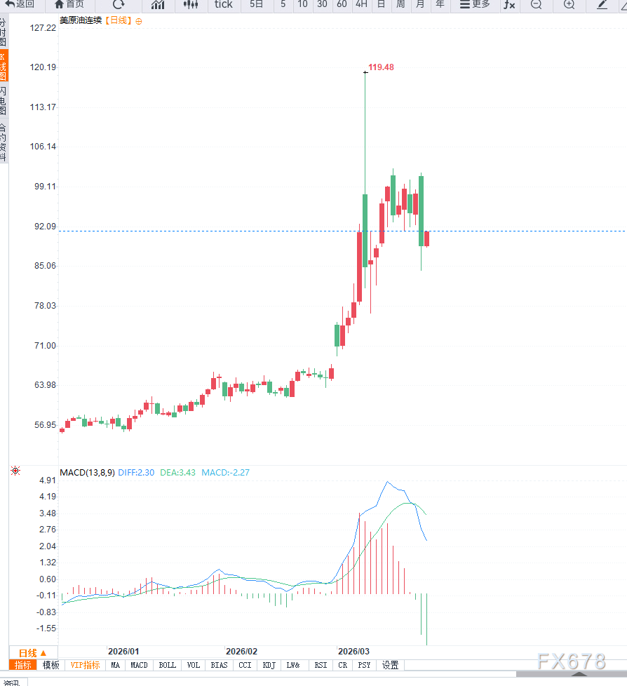 值得注意的是,这一轮市场风险资产反弹几乎完全建立在“预期变化”之上,而非现实基本面的改善。不到一小时后,伊朗方面否认正在进行任何谈判,使得市场对事件真实性产生怀疑。尽管如此,市场整体走势并未立即逆转,反映出投资者更关注政策意图本身,即美国 *** 可能倾向于避免冲突进一步升级,从而降低对全球经济的冲击。从宏观角度来看,中东局势对全球能源供应具有决定性影响。霍尔木兹海峡承担全球约20%的海运原油运输,一旦运输受阻,将迅速推升能源价格并传导至通胀体系。此前冲突升级阶段,油价持续走高已显著抬升全球通胀预期,并促使市场重新评估主要经济体货币政策路径,甚至出现对进一步加息的押注。但本轮油价暴跌显示,市场对“风险溢价”的定价具有高度弹性。一旦冲突存在缓和可能,前期积累的风险溢价会被迅速剔除,从而形成价格的剧烈反向波动。然而,这种调整并不意味着趋势反转,而更可能是阶段性的情绪修复。随着时间推移,若缺乏实质性外交进展,油价仍可能重新获得上行动能。从资产联动角度看,本轮行情呈现典型的“风险资产同步修复”特征:美元指数走弱、债券收益率回落、股票市场反弹。这一结构说明市场短期进入“通胀缓解交易”。但与此同时,市场内部仍存在明显分歧。一方面,投资者希望冲突快速结束以恢复经济稳定;另一方面,持续的军事部署与沟通反复削弱了政策可信度,使得市场难以建立中长期一致预期。在情绪层面,市场正在经历从“极端避险”向“谨慎乐观”的切换,但这一过程极不稳定。部分资金开始质疑,政策信号是否只是为了短期稳定市场,而非真正的战略转向。历史经验显示,当市场走势依赖单一政治信号驱动时,其持续性通常较弱,且容易在后续信息修正中出现反转。技术面来看,日线结构显示油价在快速冲高后形成阶段性顶部,并在消息冲击下出现放量长阴,短期趋势由强转弱。当前关键支撑位位于85美元附近,若跌破则可能进一步下探至80美元区域;上方阻力则集中在95美元一线,短期内构成明显压制。从动能指标来看,日线级别RSI已从超买区域快速回落,表明多头动能显著减弱。4小时级别上,油价呈现典型的“瀑布式下跌”结构,短期均线系统出现死叉,价格运行在均线下方,显示空头主导节奏。当前反弹更多属于技术性修复,上方关注95美元的压力情况,若无法有效突破,行情仍可能延续震荡偏弱走势。同时,MACD指标在零轴下方扩大,进一步强化短期下行风险。