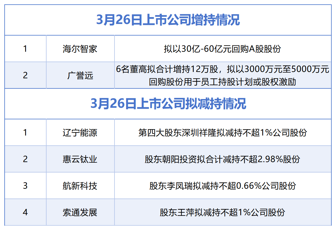 3月26日增减持汇总:海尔智家、广誉远披露增持情况,辽宁能源等4股拟减持(表) 0561news 2026年03月26日 22:16 5 0 炒股就看金麒麟分析师研报,权威,专业,及时,全面,助您挖掘潜力主题机会! 据统计,3月26日,盘后海尔智家、广誉远( *** )披露增持情况,辽宁能源、惠云钛业、航新科技、索通发展4家A股上市公司披露拟减持情况。
