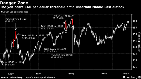 周五,日元兑美元跌幅高达0.3%,触及160.21,为2024年7月以来的更低水平,距离161.95仅咫尺之遥,若达到该水平将创下1986年以来的更低纪录。交易员一直关注160关口,因为日本当局上次出手支持日元就在这一水平附近。