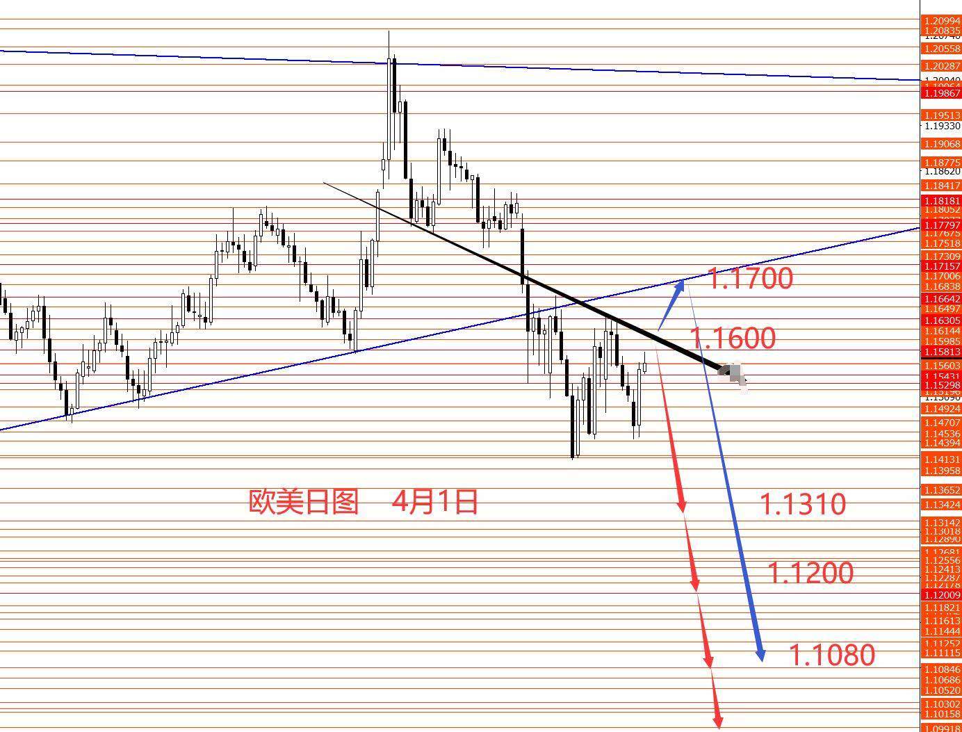 欧元三月正如预期震荡下行至1.1410区域。从图形来看,欧元还在区间震荡,后市中线1.1680以下继续看跌。本月上方重点关注1.1680强阻力,以下看跌,若后市成功站稳上方则需重新分析,这个框架就不能要了。本周操作建议:1.1600附近做空,止损1.1670,目标看向1.1310和1.1200,再看向1.1030和1.0870区域。本周红线概率较大些,蓝线做为备选方案。控制仓量,严格止损。