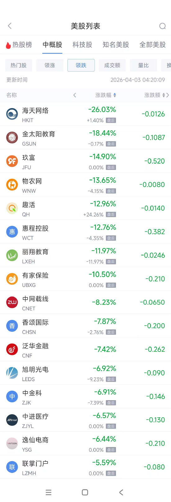 4月3日热门中概股涨跌不一,纳斯达克中国金龙指数(HXC)收跌0.34%。