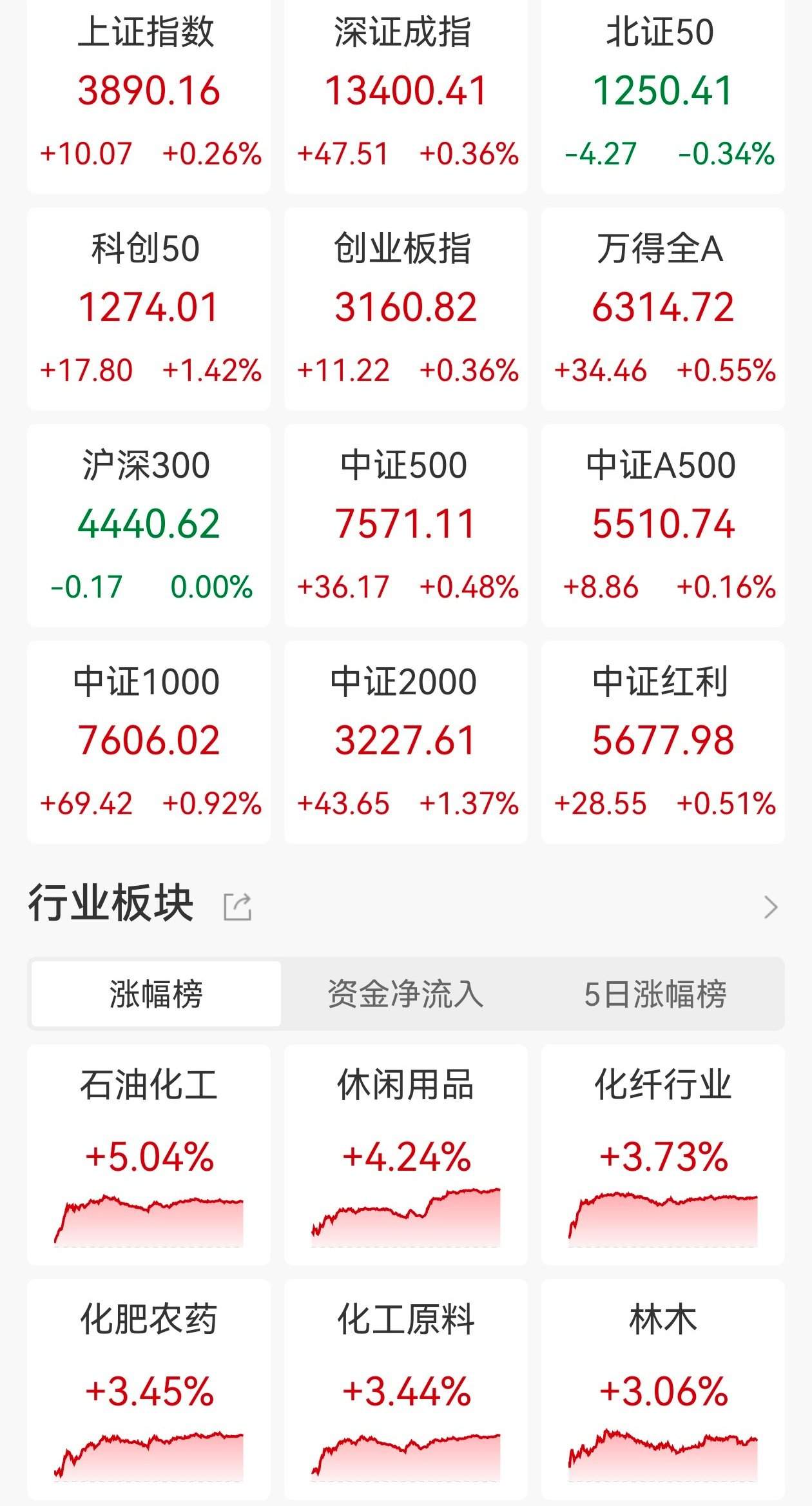 A股三大指数今日小幅震荡,截至收盘,沪指涨0.26%报3890点,深证成指涨0.36%,创业板指涨0.36%。全市场成交额1.62万亿元,较前一交易日缩量453亿元,近4000股上涨。