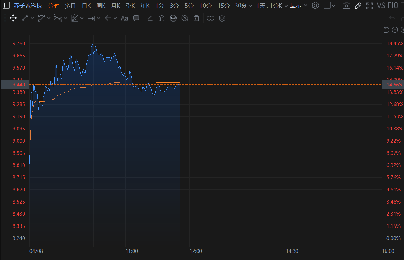 今日早盘,港股赤子城科技强势拉升,盘中更高触及9.76港元,涨幅一度达18.45%,上午收盘涨幅超14%,成交额2.8亿港元。