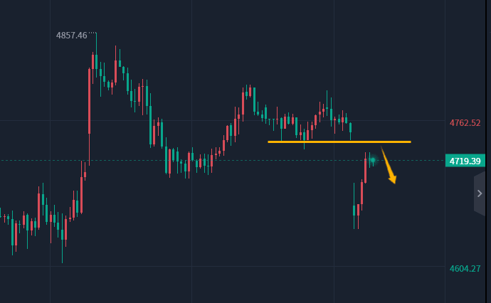 上周冲高4857之后的回落见顶,二次冲击至4800再度受挫,尤其是跌破4700之后,则预示着本周这波跌势才刚刚开始,早盘的低开下跌,日线已经跌破短期均线,关注日内反弹测试压力,继续看下跌,4750下方反弹是做空机会。