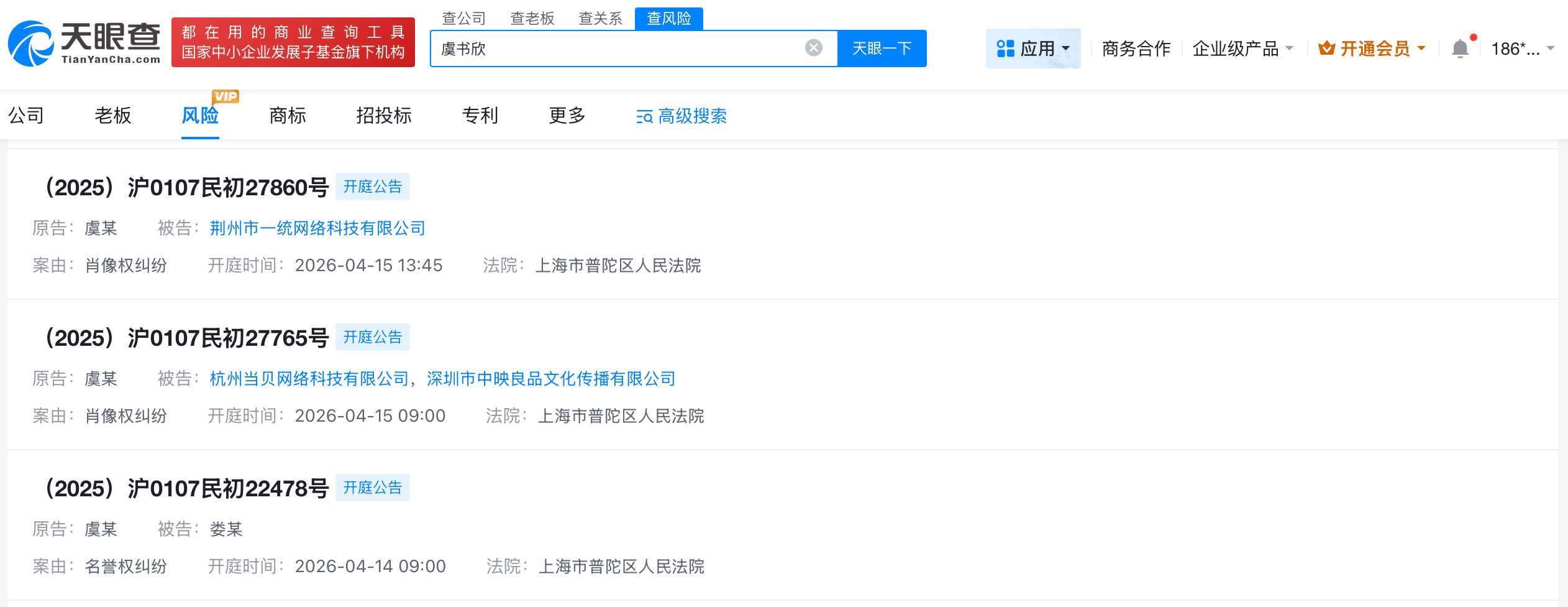 天眼查法律诉讼信息显示,虞书欣已多次发起名誉权纠纷、肖像权纠纷诉讼,被告涉及多个公司及自然人。其中,虞书欣起诉娄某于4月14日开庭;虞书欣起诉杭州当贝 *** 科技有限公司、深圳市中映良品文化传播有限公司、荆州市一统 *** 科技有限公司均于4月15日开庭。