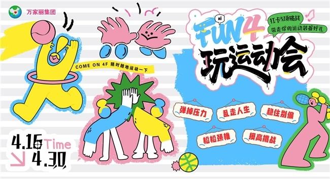 4月16日至4月30日,万家丽4F化身巨型运动乐园,以多元趣味挑战,邀你卸下疲惫、释放活力。“弹掉压力、乱走人生、稳住别偏、松松颈椎、摸高挑战”等丰富项目,兼顾趣味性与互动性,无论是独自解压还是结伴同乐,都能找到属于自己的运动乐趣。活动期间,只需打卡5项挑战,关注宇宙中心万家丽小红书官方号,在4F运动点位拍摄不少于3张照片,带话题#宇宙FUN4玩,发布小红书笔记并@宇宙中心万家丽,即可前往2F服务台领取运动装备好礼一份,数量有限,先到先得,将运动的快乐与实用好礼双双收入囊中。