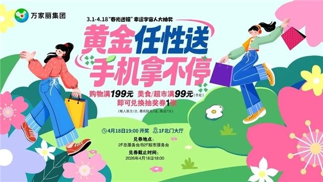 万家丽“春光送禧”幸运宇宙人大抽奖活动正火热进行中,用满满诚意回馈每一位消费者。3月1日至4月18日,凡在商场购物单笔消费满199元、美食类消费满99元,或在万家丽生活超市消费满99元,即可兑换抽奖券,参与抽奖。4月18日19:00开奖,黄金饰品、品牌手机、家用电器、豪华客房券、超市购物卡及现金红包等缤纷豪礼轮番派送,每一份惊喜都承载着万家丽的春日祝福,让每一位参与者都有机会收获意外欢喜。