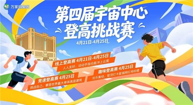 登万座山,不如登一座楼。4月21日至4月25日,第四届宇宙中心登高挑战赛热血来袭,以运动之名,赴春日之约,挑战世界更大单体高层建筑。活动同步开启线上线下双重玩法,线上趣味打卡小游戏轻松上手,动动手指就能“冲上云霄”,粉丝群排名前30名即可抱走定制好礼;4月25日,线下赛场火力全开,竞速登高赛邀你挑战自我、突破极限,趣味登高赛汇聚欢乐、共享美好,无论你是追求速度的硬核选手,还是享受过程的休闲玩家,都能在这里将登顶的快乐,兑换成看得见的丰厚奖励,在攀登中感受春日活力与城市风光。