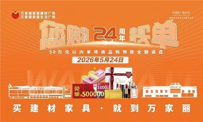不负相伴,感恩同行,万家丽“您购物・我买单――24周年庆”重磅来袭,以钜惠福利回馈新老客户,解锁家装购物新惊喜。万家丽家居建材广场与家居生活广场双场联动,全场品牌真诚让利,惊喜红包免费领、幸运盲盒下单抽、砸金蛋100%中奖,多重福利叠加,诚意满满。纯金金钞、全房家电、名品高化等海量好礼任性送,5月24日更将抽出50万元以内单项商品购物款全额返还大奖,实力宠粉、倾情回馈。双地铁直达、营业至晚间22点,一站式购齐家装好物,省心省力更省钱,让每一个家庭都能轻松焕新美好家园,开启品质家居新生活。