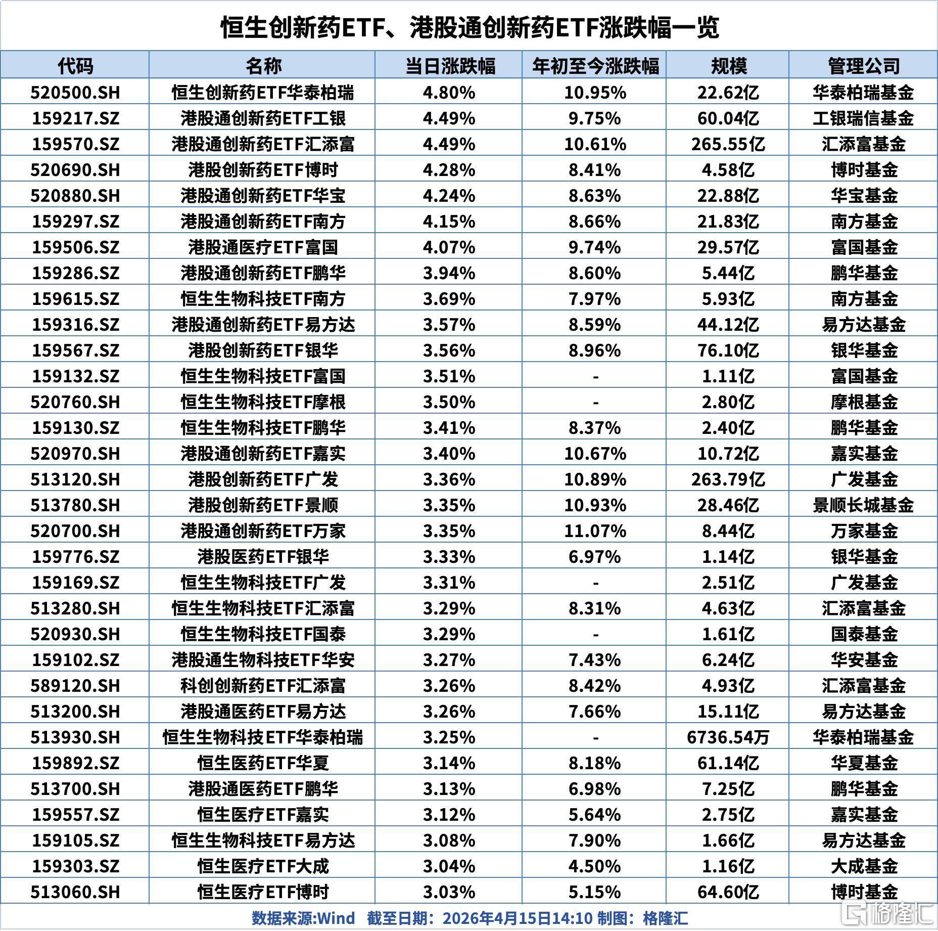 政策利好叠加市场风险偏好回升,恒生创新药ETF华泰柏瑞、港股通创新药ETF工银、港股通创新药ETF汇添富、港股创新药ETF博时、港股通创新药ETF华宝、港股通创新药ETF南方、港股通医疗ETF富国涨超4%;港股通创新药ETF鹏华、恒生生物科技ETF南方、港股通创新药ETF易方达、港股创新药ETF银华、恒生生物科技ETF富国、恒生生物科技ETF摩根涨超3.5%。