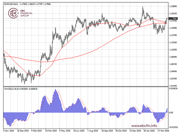 欧元已出现死亡交叉,由于MACD指标未呈扩张态势,看跌反转并非板上钉钉。若无法突破1.1830美元附近的阻力位,很可能出现新一轮下跌。