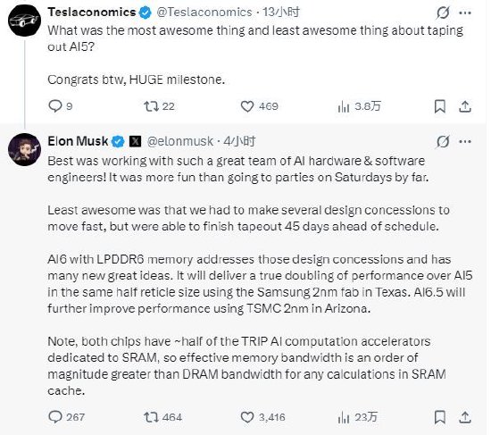 有网友询问:“AI5芯片流片过程中最棒和最不棒的事情分别是什么?”
