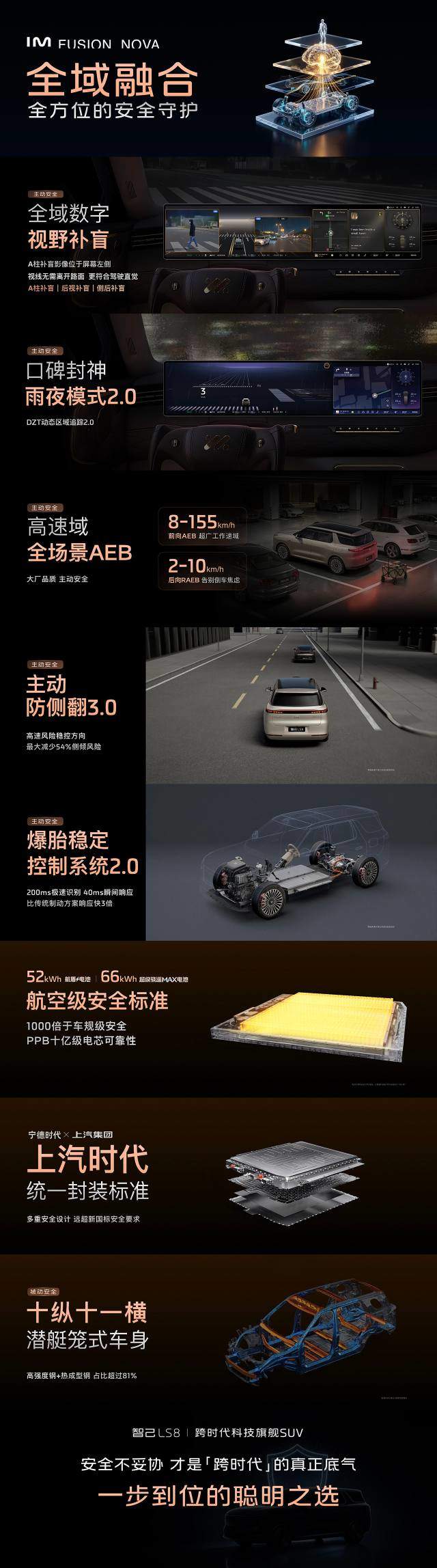 凤凰网科技讯 4月16日,智己LS8上市。新车首发行业首创的IM Fusion Nova全域融合架构,搭载全域数字视野补盲、雨夜模式2.0及高速域全场景AEB,配备航盾电池与超级骁遥Max电池,航空级安全标准,并采用三重冗余开门安全设计。