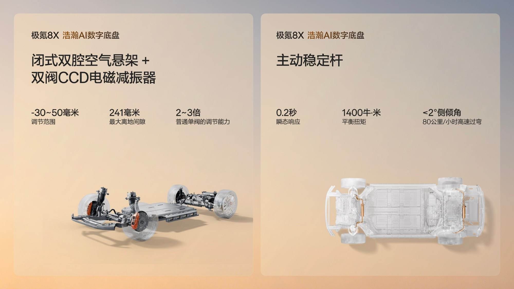 极氪8X基于浩瀚-S超级电混架构打造,全栈900V高压平台。动力上搭载混动领域首个三电机兆瓦电驱,峰值功率1030kW,马力超1400PS;配备同级更高功率145kW增程发电机及2.0T超级电混专用发动机(205kW)。三电机版零百加速仅2.96秒,双电机版3.7秒。