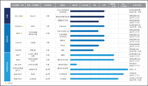 从在研管线看,汇伦医药在研产品多处于早期临床阶段,商业化落地周期长、风险高。公司的四款I类创新药物中,HL-1186作为中国首款进入临床研究的Nav1.8抑制剂,目前处于临床Ⅱ期阶段;YD0293作为全球唯一正在临床开发的用于治疗慢性鼻窦炎的DPP1抑制剂,同样处于临床Ⅱ期阶段;H057作为全球首款且唯一处于临床阶段的可吸入西维来司他钠候选药物,也尚未进入后期临床。