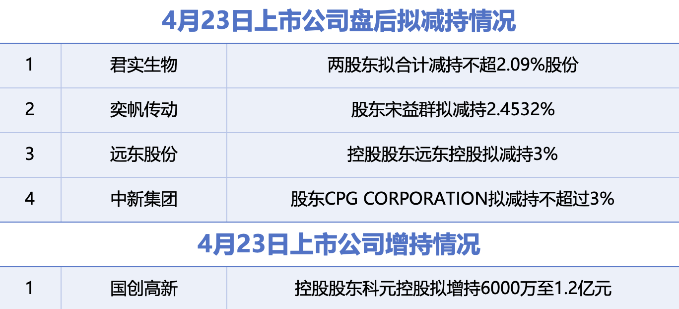4月23日增减持汇总:君实生物等4股拟减持,国创高新增持(表) 0561news 2026年04月23日 23:09 3 0 炒股就看金麒麟分析师研报,权威,专业,及时,全面,助您挖掘潜力主题机会! 据统计,4月23日,盘后,君实生物、奕帆传动、远东股份、中新集团在内的4家A股上市公司披露拟减持情况。国创高新披露增持情况。