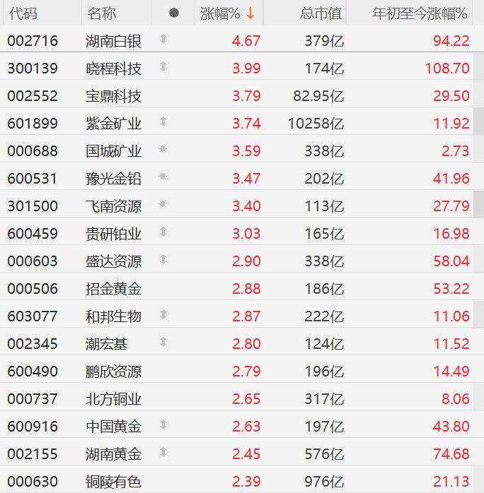 A股异动丨黄金概念股普涨,湖南白银涨超4%,紫金矿业涨超3% 0561news 2026年02月09日 10:38 3 0 A股市场黄金概念股普涨,其中,湖南白银涨超4%,晓程科技、宝鼎科技、紫金矿业、国城矿业、豫光金铅、飞南资源、贵研铂业涨超3%。消息面上,金银价格反弹,现货黄金今日盘中反弹至5046.79美元,现货白银反弹至81.67美元。 (:贺